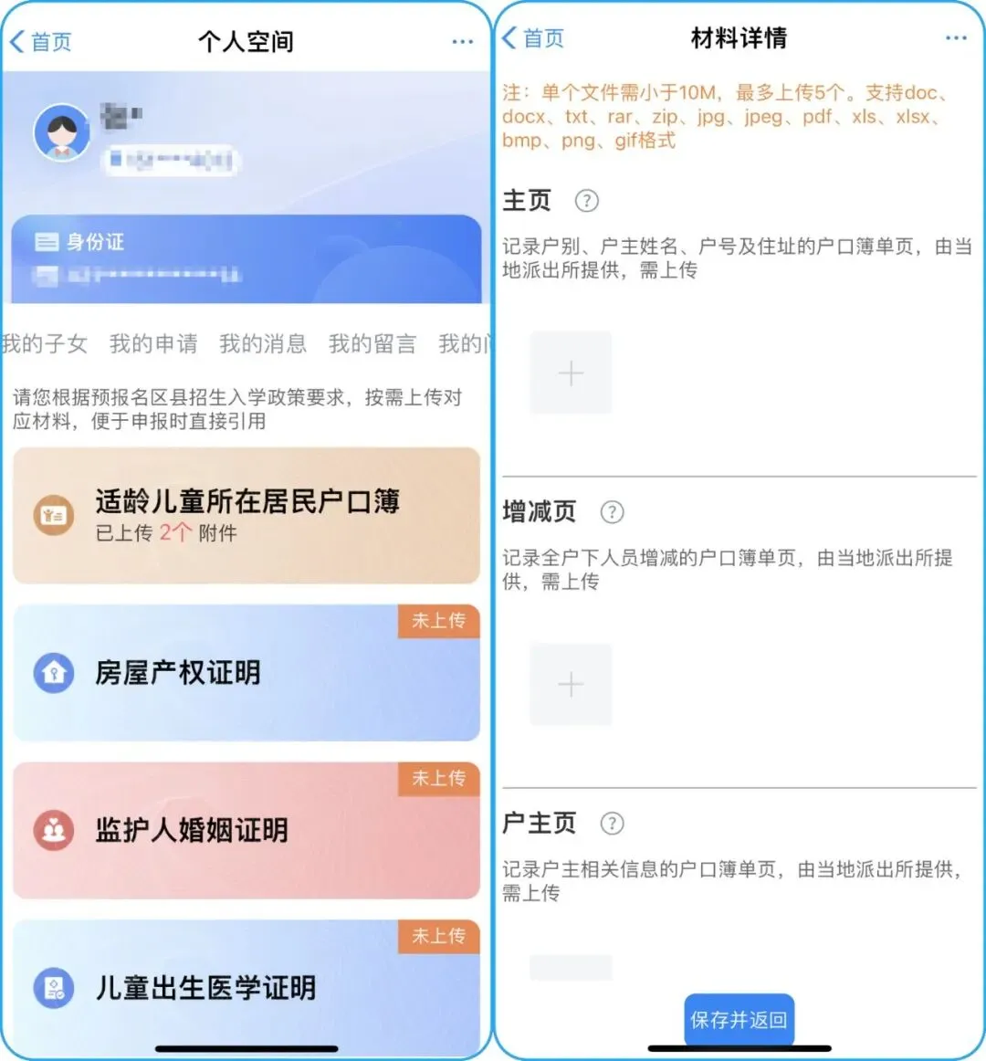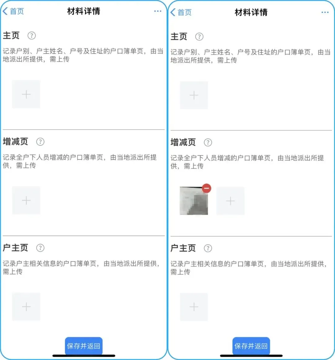 点击材料名称下的“+”按钮,则可选择您准备好的材料照片进行上传。完成所有细分材料上传后,点击“保存并返回”,完成户口簿材料上传,其他需要维护的材料参照此流程即可。