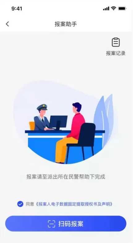 2、点击【扫码报案】扫描民警出示的“案件二维码”,点击【开始填写】填写报案信息;