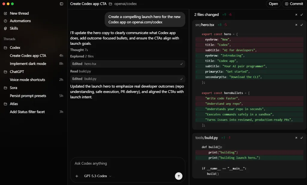 在Anthropic发布Claude Opus 4.6的同一天,Open AI也正式推出了GPT-5.3-Codex。Codex能在无需提示的情况下自动运行,处理诸如问题分流、告警监控、CI/CD等工作,借助内置的工作树与云端环境,智能体能够在多个项目间并行工作,原需数周的开发周期可缩短至数天。OpenAI还推出了专门的Codex App,配备了多智能体指挥中心以及本地化集成。