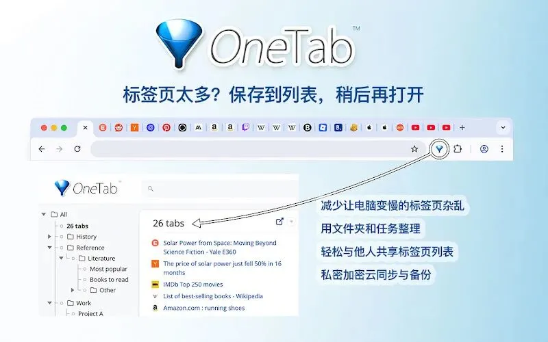 点评:打开了几十个标签页舍不得关,电脑卡成 PPT?点一下 OneTab,它把所有标签页收缩成一个列表,内存占用瞬间释放 95%。