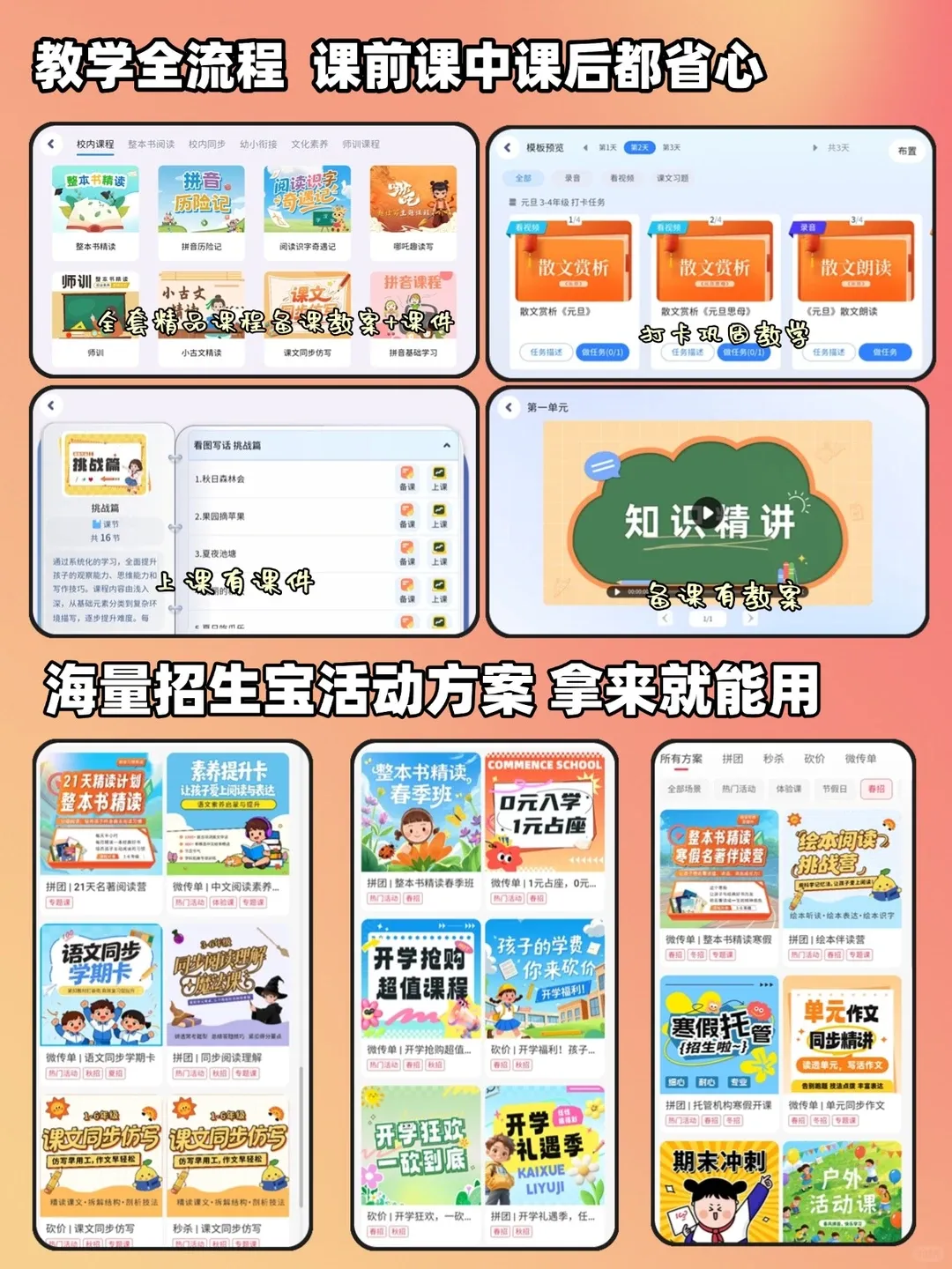 ✅ 招生工具,一键搞定拼团、秒杀、体验课等招生活动随时生成,轻松拓展新客。