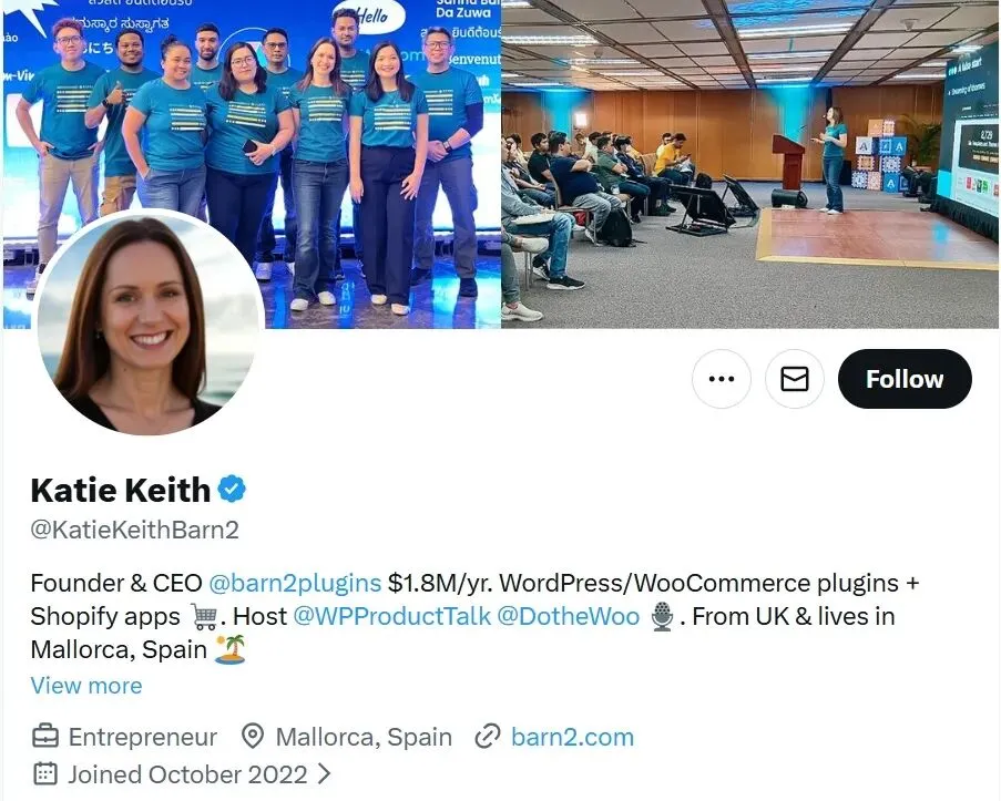 Katie 的公司叫 Barn 2 Plugins,专注于 WordPress 和 WooCommerce 生态。