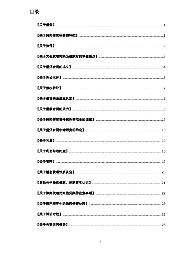 民间借贷纠纷律师办案实务问答.pdf 今天小编给大家免费发放的资料是 民间借贷纠纷律师办案实务问答.pdf 免费领取方式 识别下方二维码 关注“最高裁判案例库”公众号 在对话框内回复: “实务” 按后台指引领取免费资料 本期法律干货资料预览 由于内容较多,本文仅展示部分内容,领取后查看更多 免费领取方式识别下方二维码关注“最高裁判案例库”公众号在对话框内回复: “实务” 按后台指引领取免费资料 更多资料 一键解锁 附:各类资源目录(已更新到600+条,更多资料持续更新中……) 1.最高法历年指导性案例合集汇编 2.最高检历年指导性案例合集汇编 3.机动车交通事故责任纠纷裁判指引 4.建设工程施工合同纠纷事实查明的思路与方法 5.2024版全国法院审理建设工程案件解释、意见、纪要等汇编 6.最高人民法院历年公报案例汇编手册,共20万字 7.常见罪名定罪量刑一览表汇编手册 8.公司法相关法规及指导性案例汇编 9.国内律师协会办案业务指引合集 10.全国法院:关于审理民间借贷事实认定的指导意见 11.婚姻家事纠纷裁判规范及典型案例合集汇编 12.金融合规及反洗钱法律汇编 13.尽职调查报告模板 14.劳动合同文本设计8大招 15.律师办理婚姻案件(85份)文书范本 16.律师常用数据及公式大全 17.律师民事诉讼代理技巧 18.民法典及相关司法解释汇编 19.全国劳动法律法规汇编(升级) 20.各级法院审理建设工程类纠纷规范性文件汇编 21.青年律师交通事故案件处理实务 22.民法典学习解读(78页 1.6万字讲稿) 23.有限责任公司股东出资规范指引 24.刑事案件工作流程108步 25.200份律师起诉状范本集 26.12套律师专用表 27.整理证据的十个步骤 28.中国百强上市企业合同模板精选 29.民法典条文与案例解析手册 30.劳动合同必备模板 31.民法典“连带责任”:20类规定汇总+实务要点+典型案例 32.民间借贷纠纷实务资料合集 33.各高院建设用地使用权转让合同纠纷判决汇编 34.建设工程领域近百个经典裁判案件汇编手册 35.各类法律文书及格式详解汇总 36.企业法律顾问常用文书 37.新版工伤赔偿一览表,超详细 38.常法顾问服务律师常用文本清单 39.公司法经典案例汇编 40.全套企业法律顾问制度合集,共计45份 41.微信司法调查取证 42.公司治理学习手册 43.新三板全套法律文书 44.税收筹划干货汇编 45.各类承揽合同范本集 46.婚姻继承法律资料汇编合集 47.地方法院执行法规汇编 48.27种法定不认为是犯罪或者不按犯罪处理的情形 49.260份企业法律顾问常用司法文书 50.律师办案流程实用表格 51.税务筹划经典案例100篇 52.律师必备法律检索资料包 53.2024新版夫妻婚内忠诚协议保证书 54.律师WORD技能学习手册 55.各高院普通破产债权确认纠纷判决汇编 56.分期付款买卖合同纠纷民事调解书精选案例汇编 57.商品房销售合同纠纷民事调解书精选汇编 58.人民法院报刑事审判析疑断案合辑(2024年版) 59.2023版律师常用计算公式及计算器 60.民事诉讼文书样式:制作规范与法律依据 61.交通事故司法观点及法律汇编 62.关于诉讼时效起算的91条指导意见汇编手册 63.律师办理各类案件实务指引合集(共计23类) 64.45份法律顾问年终总结与工作计划模板 65.最高院民一庭关于建设工程纠纷裁判观点汇编 66.企业惩罚制度范本 67.建设工程合同案件诉讼手册 68.264张思维导图读懂民法典 69.国企合规与法律风险防控 70.最高院婚姻继承案件判例汇编 71.证据目录及诉讼证据材料模板汇编 72.企业内控管理流程手册 73.借款合同范本集 74.刑法对17个罪名量刑重大调整 75.再审实务工具 76.电子证据指引 77.民营企业法律风险防范手册 78.强制执行疑难法律解答汇总 79.法务专员年终报告案例手册 80.合同常见棘手问题汇总 81.网络侵权责任纠纷案例精选 82.工伤案件的处理流程(2025版) 83.离婚协议模板100套 84.工伤实务处理攻略(流程+法规+协议) 85.新旧《刑事诉讼法解释》对照手册 86.劳动仲裁全套文书(单位版) 87.法律文书范例综合大全集 88.建设工程领域必备合同范本 89.民商事合同模板合集 90.央企内部合规手册及其相关配套制度 91.人民法院案例库407个行政案例法律文书 92.劳动法普法宣传课件教育ppt 93.律所内部管理常用文书 94.车库纠纷类判决案例汇编 95.律师干货:诉讼业务办理要点全梳理 96.离婚常见法律问题74条 97.合理避税筹划技巧.doc 98.人资法务技能指导汇编 99.公司企业法律法规汇编手册 100.执行案件办案规范手册汇编 101.律师必会的200个劳动法常见问题 102.交通事故实务必备协议模板大全 103.入职必签法律文书合规配套工具65套+(综合) 104.468份公司章程范本(word可修改) 105.涉股权类税务问答手册 106.买卖合同相关资料汇编 107.民法典50个问题.pptx 108.商业秘密侵权纠纷案例汇编 109.最高法关于重大误解的核心裁判观点汇编 110.破产管理人实务工作手册(word/pdf版) 111.购销合同范本集 112.执行异议之诉案例汇编手册 113.2024年起诉书范本 114.执行疑难法律问题解答93则 115.最高法关于公司人格混同的裁判观点汇编 116.车位纠纷二审判决案例汇编 117.企业合规法律汇编 118.建设工程合同纠纷82个裁判观点解析汇编手册 119.78套律师常用起诉状模板(word可修改) 120.经济适用房转让合同纠纷判决汇编-副本 121.会见笔录出庭申请书取保候审申请书授权委托书模板 122.交通事故损害赔偿司法鉴证文件汇编 123.法院类案办