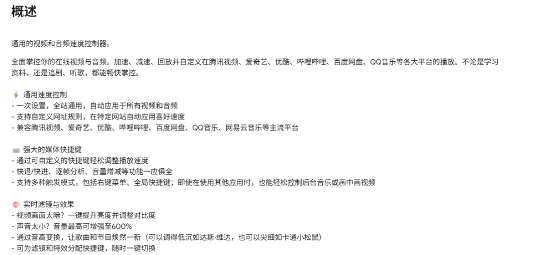 点评:B站、网课、广告、甚至网页背景视频,它都能控制速度(0.1x – 16x)。还能调整声音音调、画面滤镜。追剧党和网课党的救星。