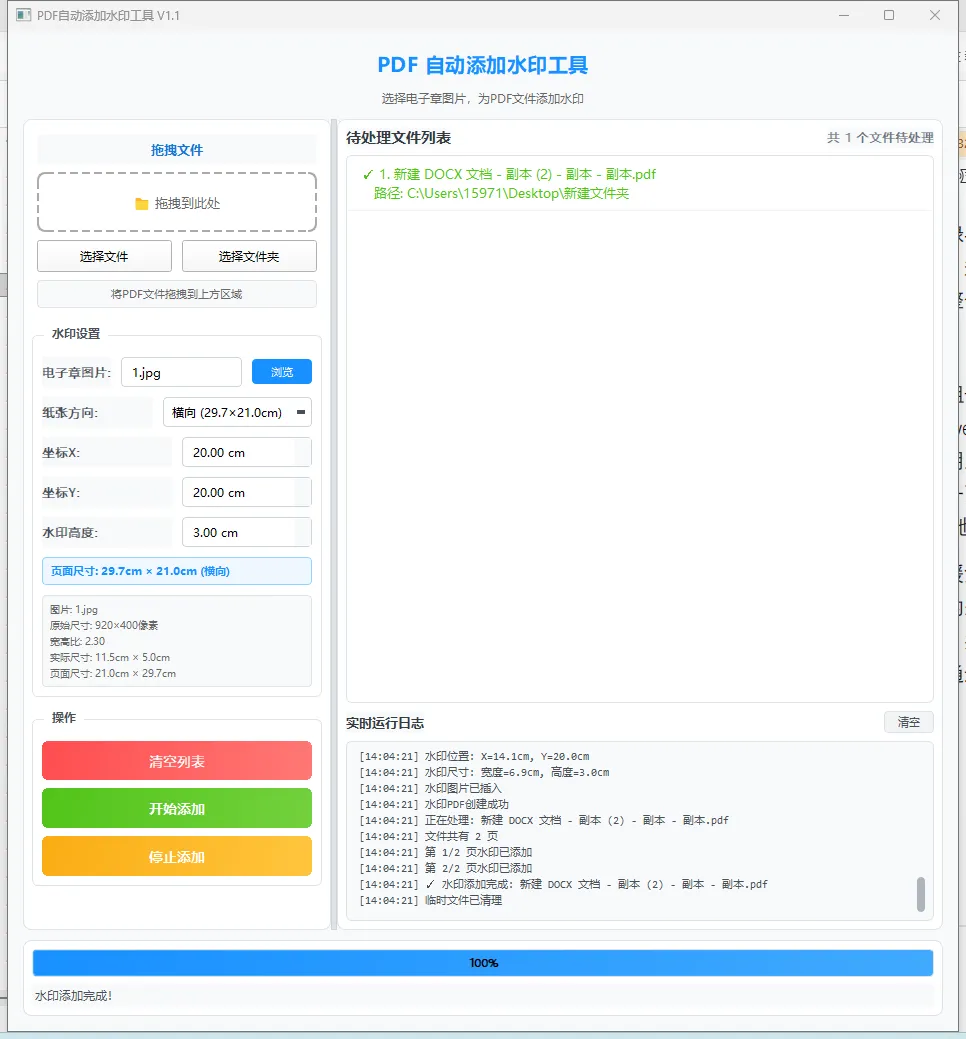 无需手动逐个保存,工具自动为每个 PDF 的每一页添加水印,处理完成直接替换原文件,省时又省心。