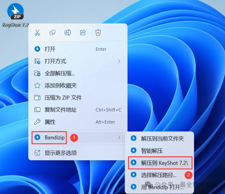 1、下载KeyShot 7.2软件安装包到电脑上,右键选择【解压到KeyShot 7.2\】