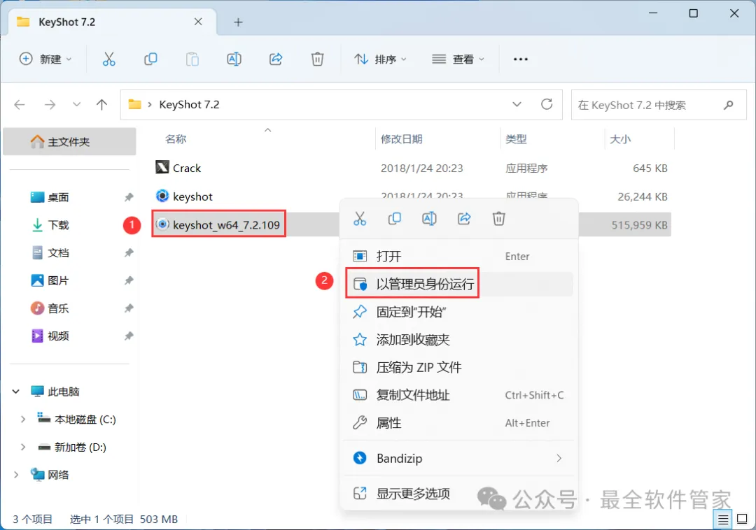 3、找到【keyshot_win64_7.2】应用程序,右键选择【以管理员身份运行】它