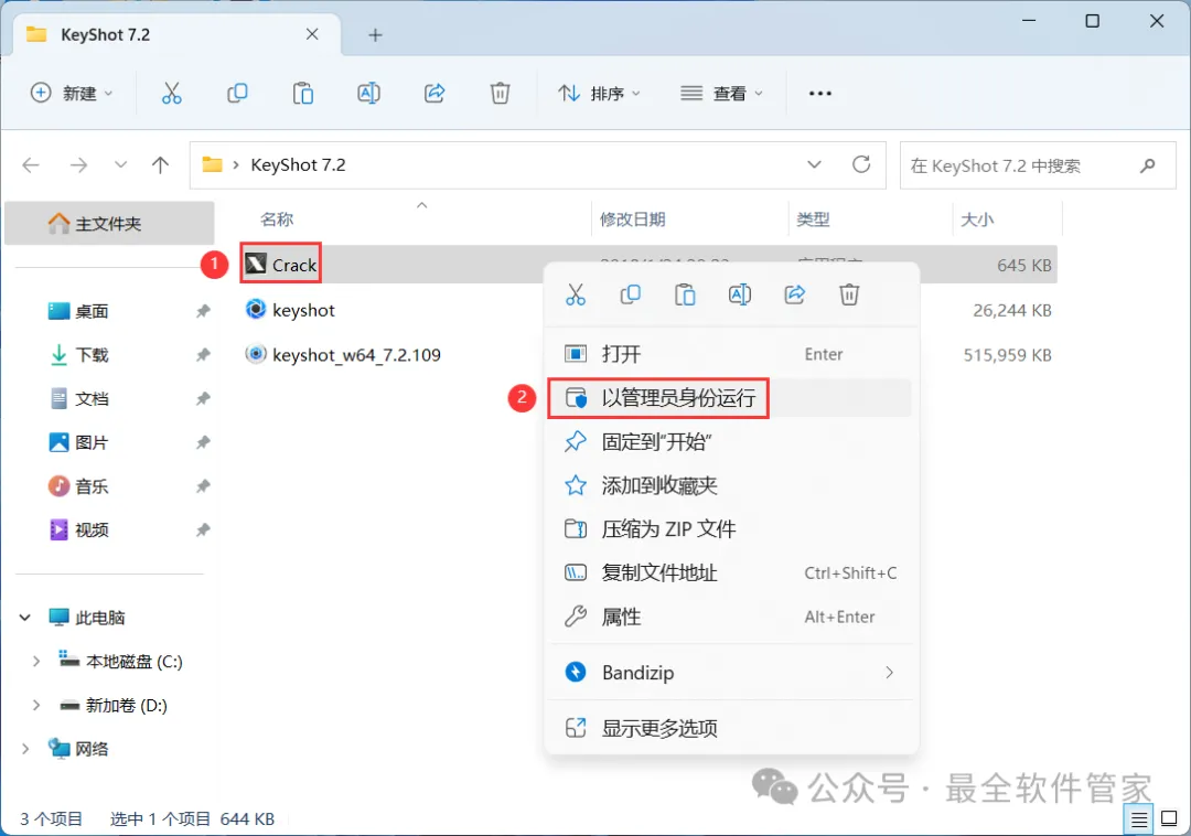 15、回到KeyShot 7.2文件夹,找到【Crack】程序,右键选择【以管理员身份运行】它