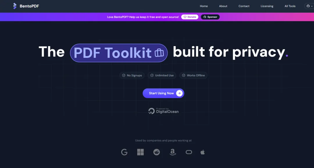 BentoPDF 是一款隐私优先、轻量化的开源PDF工具箱,主打纯客户端本地处理,适配 NAS、个人电脑等多场景部署使用,相比传统PDF工具更贴合普通用户对隐私、速度和轻量化的需求,也是 Stirling PDF 的优质替代选择(主要是stirling最近开始收费了,不过也正常,毕竟商业化变现才能维持开发者的无限动力)。