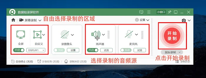 怎么用电脑录屏?数据蛙录屏软件的页面设计和别的不一样。没有广告弹窗,可视化窗口简洁又小巧,文字说明清晰明了,对人的眼睛特别友好!