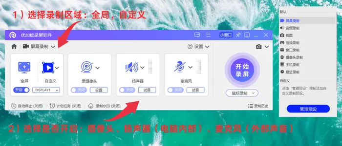 优加蛙录屏软件兼容Windows 7、10、11及macOS系统,可适配不同操作系统用户的使用需求。软件提供多种录制模式,包括全屏录制、自定义区域录制、窗口录制、游戏录制、音频录制以及摄像头画中画录制等,能覆盖多数日常及专业录制场景。