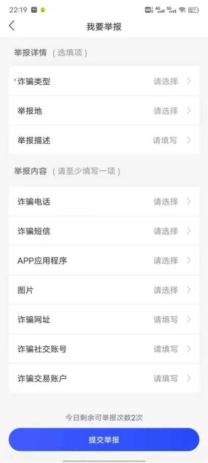 2、填写诈骗类型、报案地、举报描述;