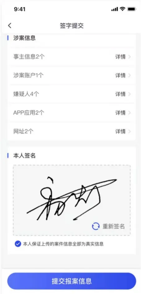 3、点击【下一步】,进入签字提交页,确认信息准确无误后,完成报案人签字后点击【提交报案信息】完成报案;