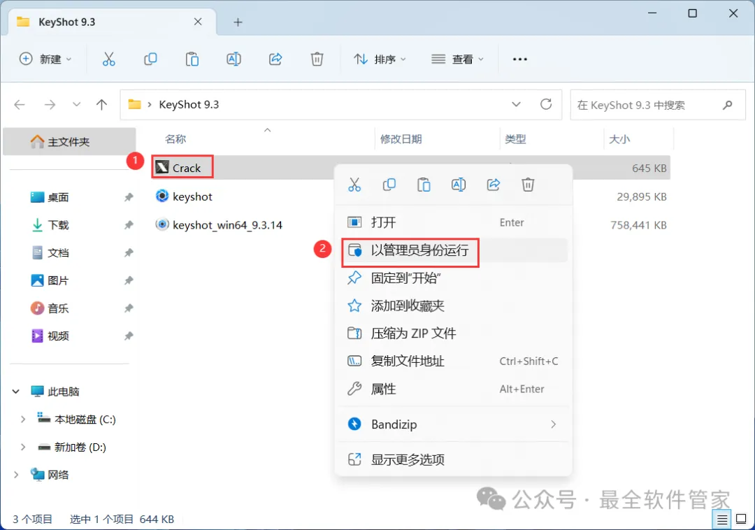 15、回到KeyShot 9.3文件夹,找到【Crack】程序,右键选择【以管理员身份运行】它
