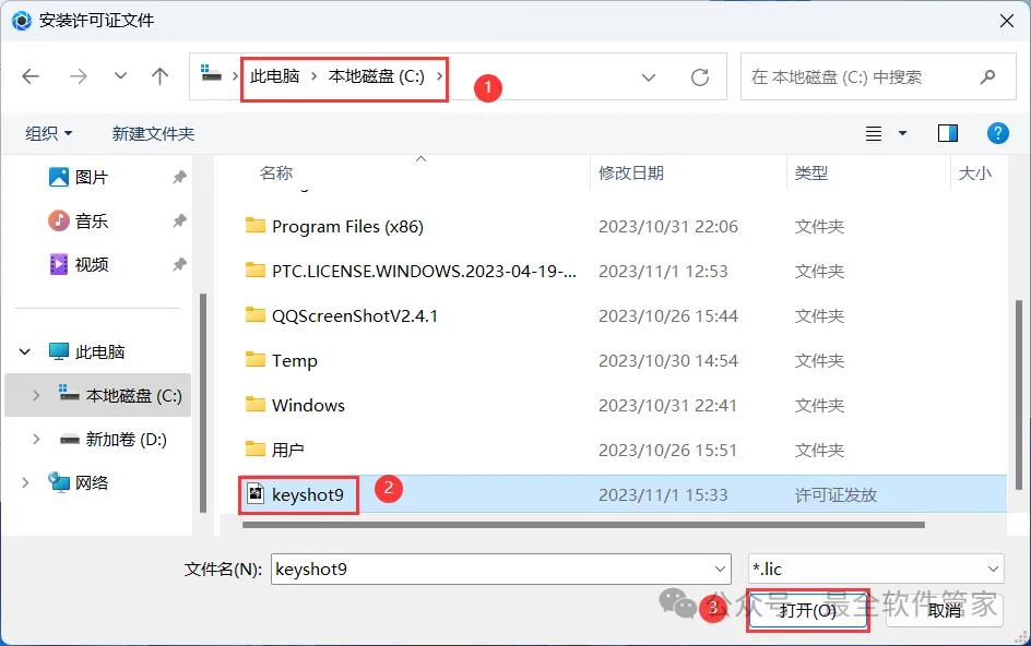 22、选择路径到C盘,找到并选中【Keyshot9】程序,再点击【打开】