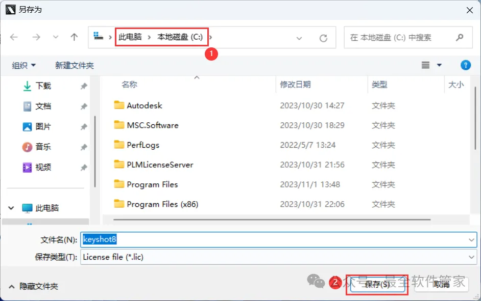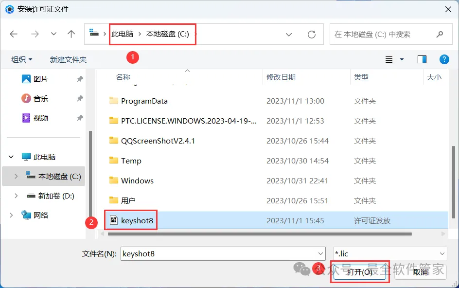 22、选择路径到C盘,找到并选中【Keyshot8】程序,再点击【打开】