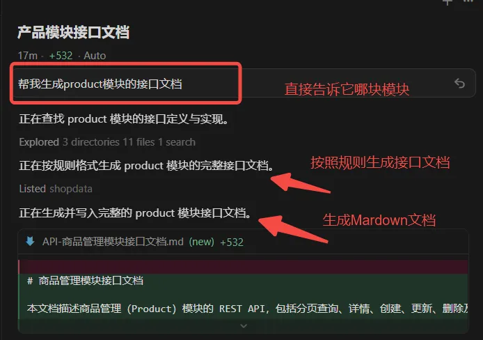当用户要求“生成接口文档”,分析代码并按照以下的格式输出Markdown接口文档