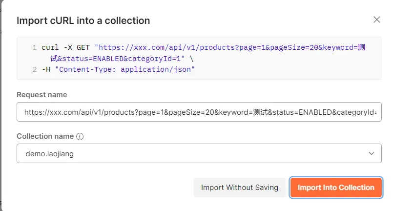 复制文档中的curl命令直接贴到postman中,方便使用