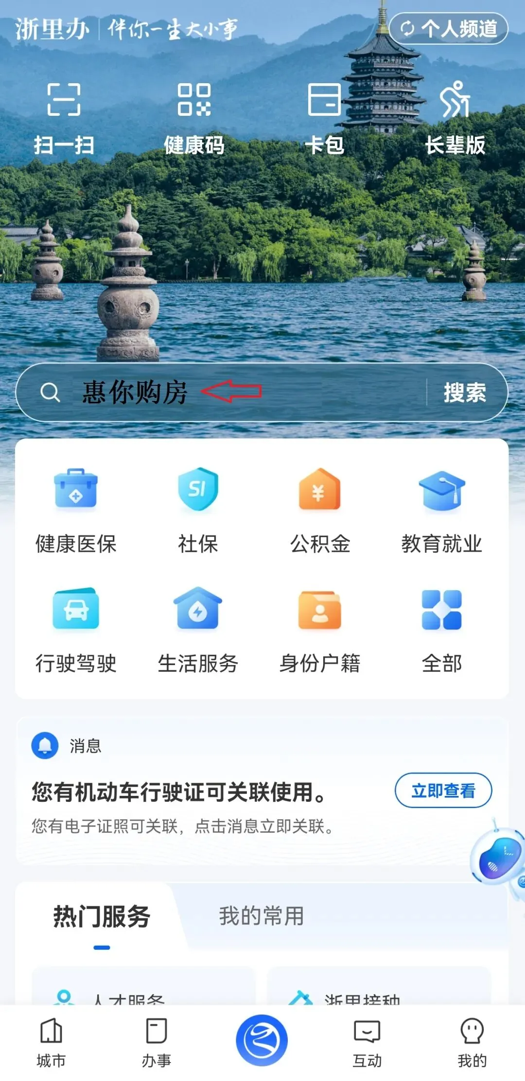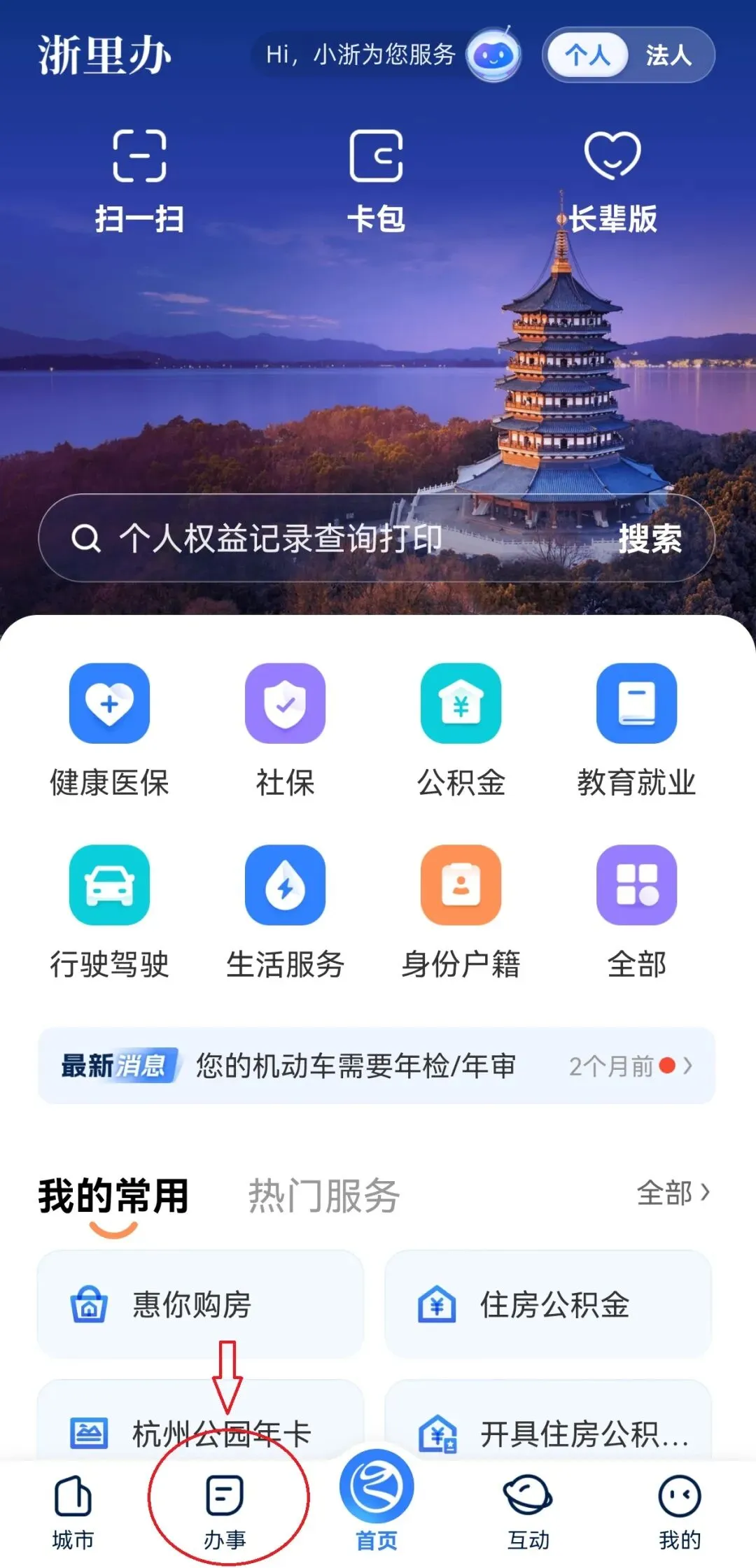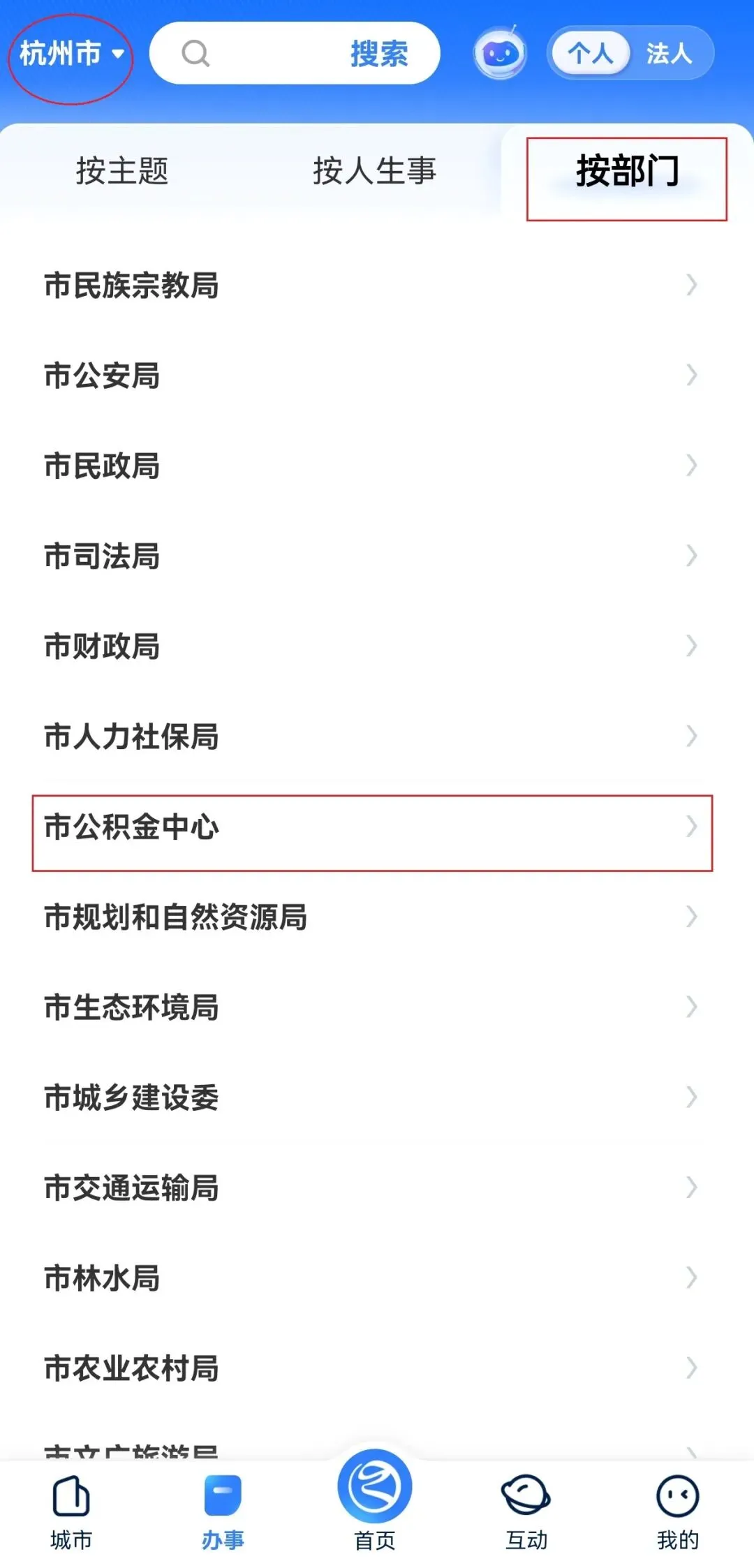 手机下载浙里办app注册或登录,方法一:首页底部菜单栏选择“办事”,进入办事页面后,按顺序选择“杭州市→个人频道→按部门→市公积金中心”;