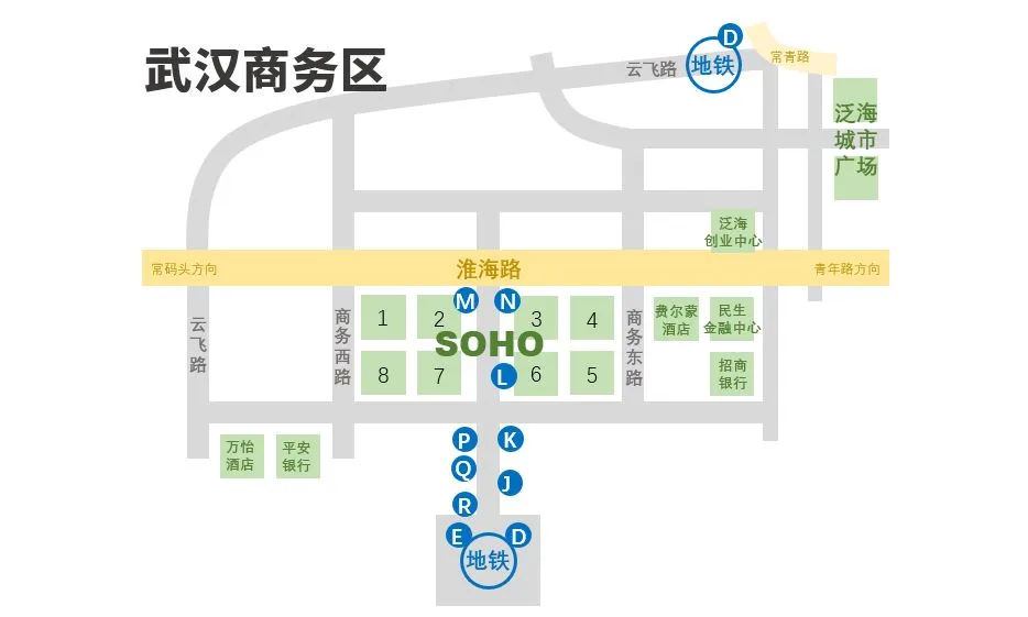 武汉商务区地铁站有10余个出口,你只需认识其中四个便可,两个超大的露天出口P和K,对应最近的是7号楼和6号楼,离地铁站最远的M和N口,对应了2号楼和3号楼。