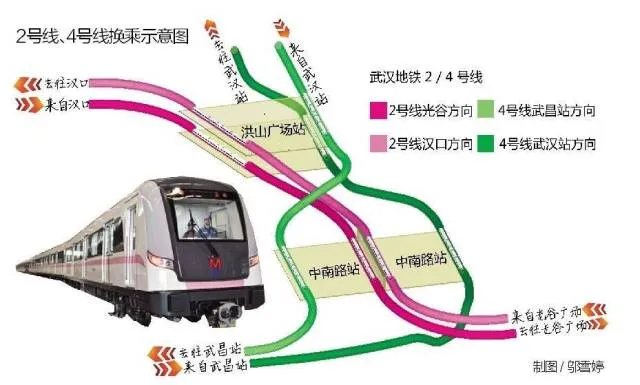 也就是说,在中南路站,同一个站台上的2号线和4号线都是往同一个方向开车的,2号线光谷方向对应了4号线汉阳方向,洪山广场的情况就恰好相反,2号线光谷方向对应了4号线武汉站方向。