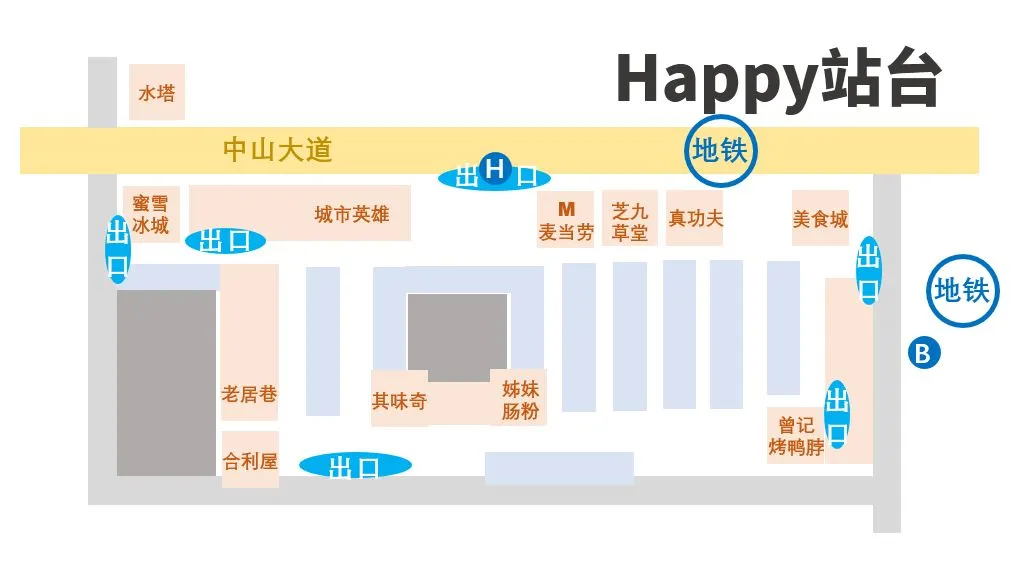 不过记住几个关键店铺,就能轻松定位你在Happy站台的位置,迅速找到出口。