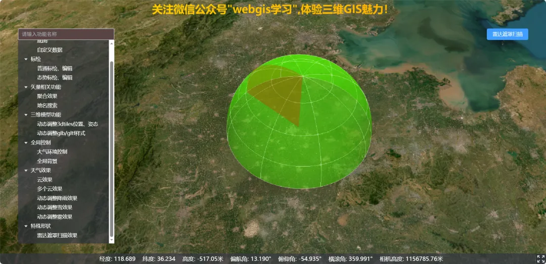 const addRadarMaskScan = () => {const radarMaskScan = new RadarMaskScan(viewer!,{id: "radarMaskScan",radius: 100000.0,position: [116.439, 37.473],});viewer?.camera.setView({destination: Cartesian3.fromDegrees(116.439, 37.473, 700000.0)});}