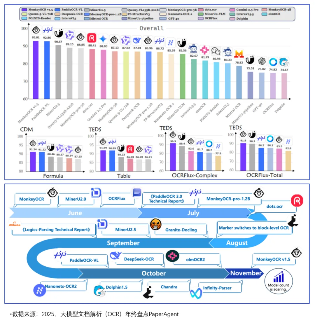 这一行业痛点已引发大模型领域广泛关注,2025 年第四季度,行业头部企业集中发布多款基于多模态大模型的 OCR 解决方案,持续刷新OCR行业SOTA,为解决PDF文档结构化困难提供全新路径。