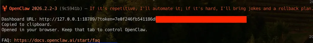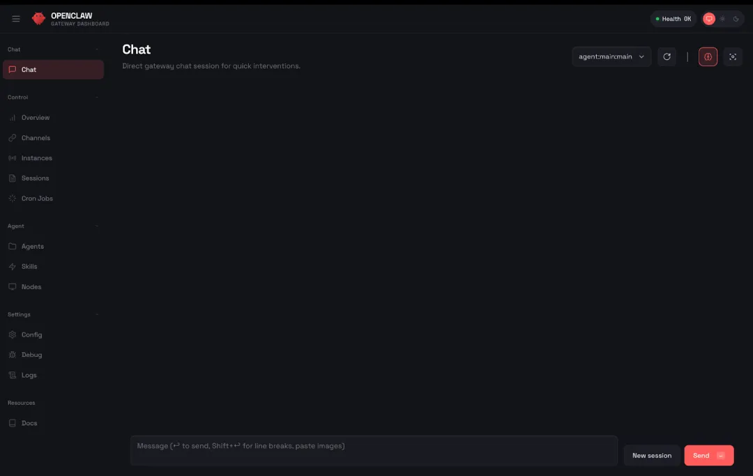 接着,我们尝试打开网页,打开后就是如下图所示,URL是http://127.0.0.1:18789/?token=xxx,其中xxx每个人不同,注意自己屏幕上的显示即可。