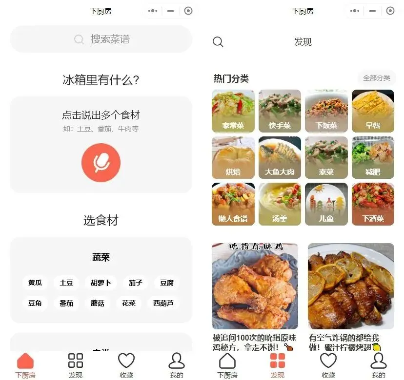 除了可以直接查找做的饭菜,我们也可以语音说出食材,软件会自动为我们查找合适的美食。或者直接在发现里,瞧一瞧群众的眼光~