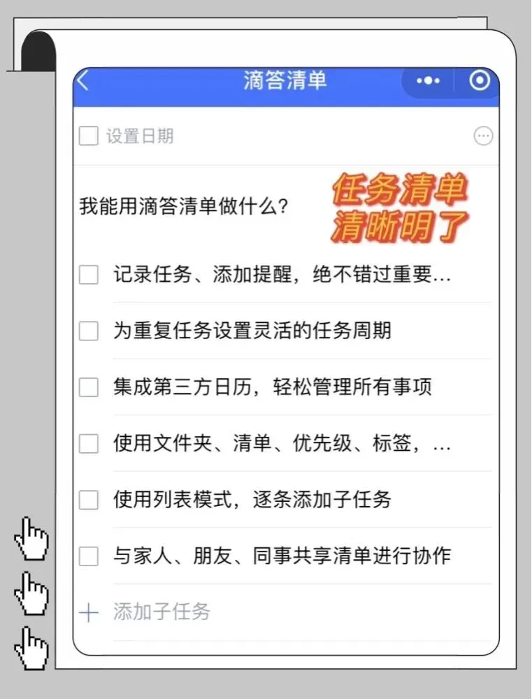 滴答清单主要就是列一些计划,并且可以设置时间去提醒,像父母、朋友生日或者一些重要节日,都会提前开始通知,相当于带了一个私人小助理在身边。