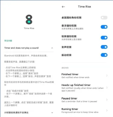 它支持设置主题,包括日间模式和夜间模式,支持颜色设置,支持设置通知与声音,包括:开始计时器、暂停计时器、计时器完成的通知声音。