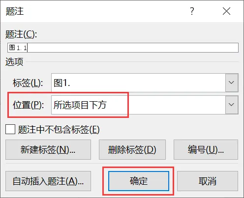 6️⃣ 因图题位于图的下方,我们在“题注”对话框中,从“位置”下拉菜单中,选择“所选项目下方”。最后点击“确定”按钮。