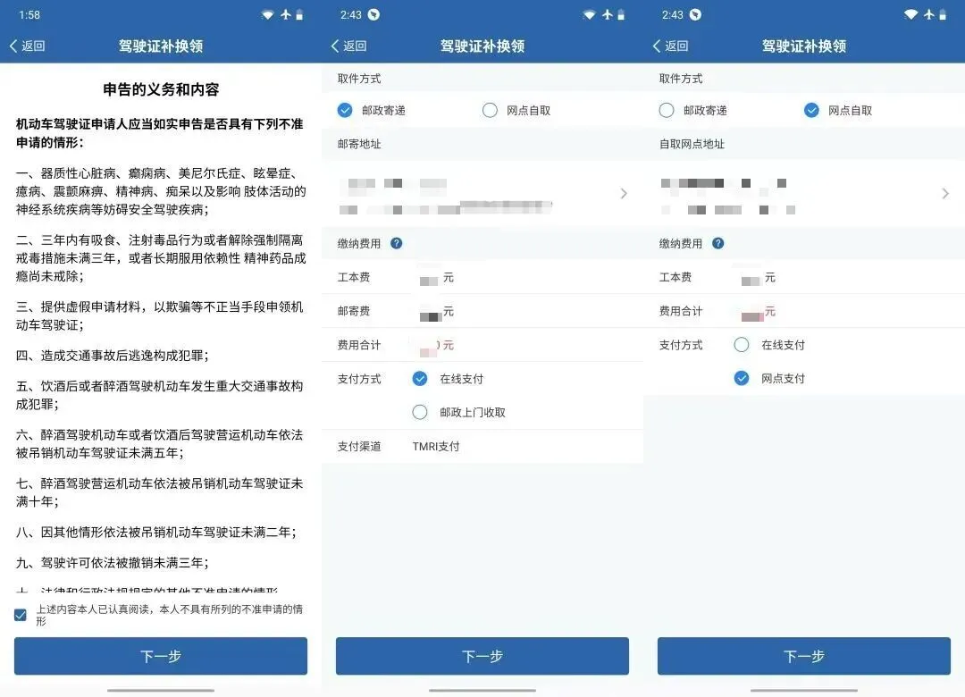 认真阅读驾驶证补换领用户申告并确认后,点击【下一步】,进入取件方式、支付方式选择页面。您可以选择自取或邮寄两种方式。如自取,则需选择自取网点;如邮寄,则需填写收件地址。