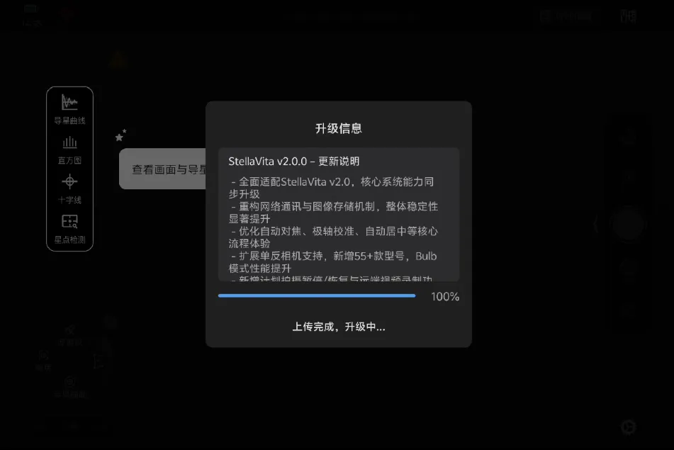 若升级进度长时间停留在100%,通常可能由于手机仍连接在外部局域网,尝试重新连接StellaVita热点后继续。