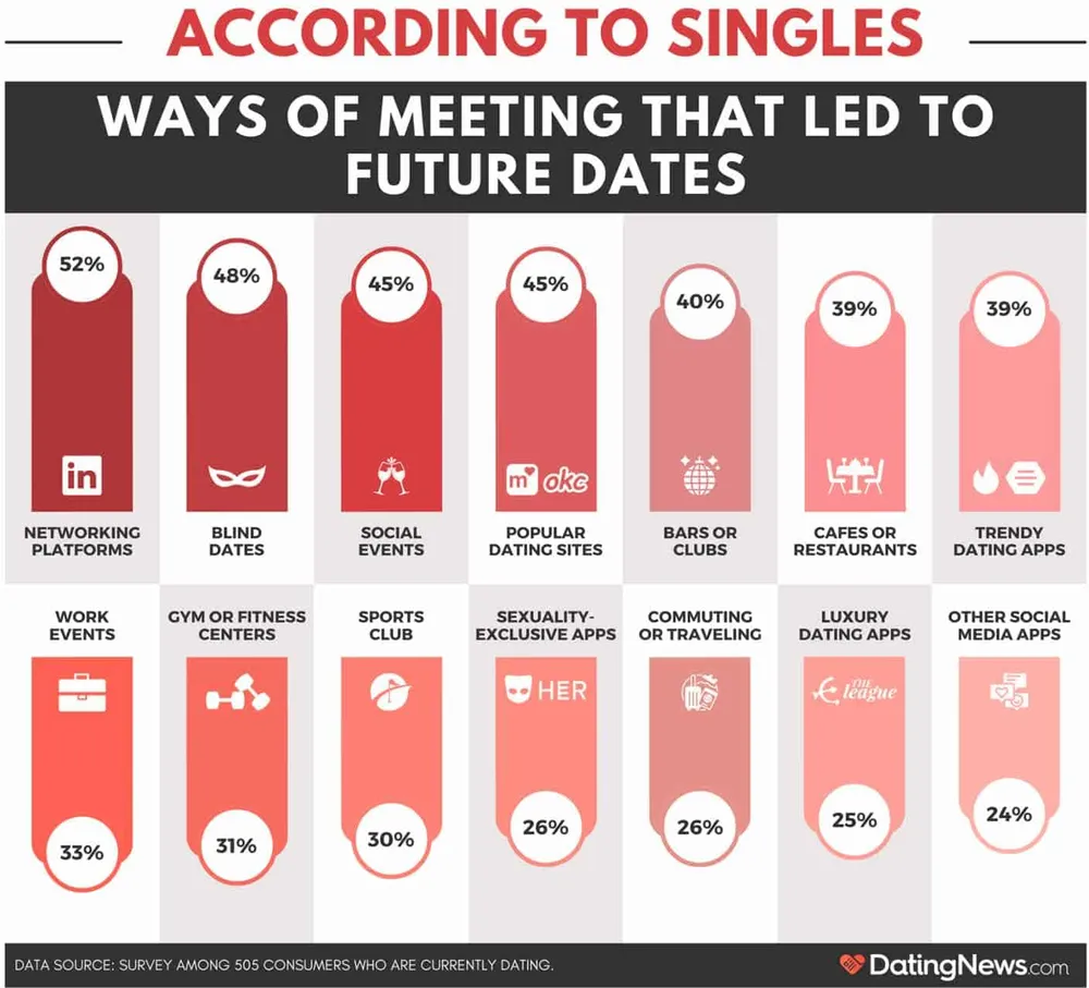 别小看这个趋势,最新统计表明,美国单身成年人在LinkedIn、Facebook等泛社交平台上获取的约会机会已超过Tinder、Hinge等垂直约会应用。根据DatingNews.com在2024年进行的一项调查数据,有52%的受访者会通过这种方式结识约会对象。