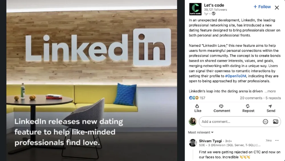 换句话说,这可能是当下Z世代中最流行的相亲方式之一。受欢迎程度之高,以至于TikTok上也出现了无数情感博主的手把手教程。甚至已经有公司在LinkedIn里开始举办联谊会了。