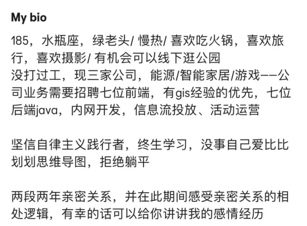 比如,通过LinkedIn进行筛选时,由于心理预期足够高,大多数人的招安条件一定是比自己好的。他们期待从这里捡漏一个地位高、赚钱多、情绪稳定的优质对象。