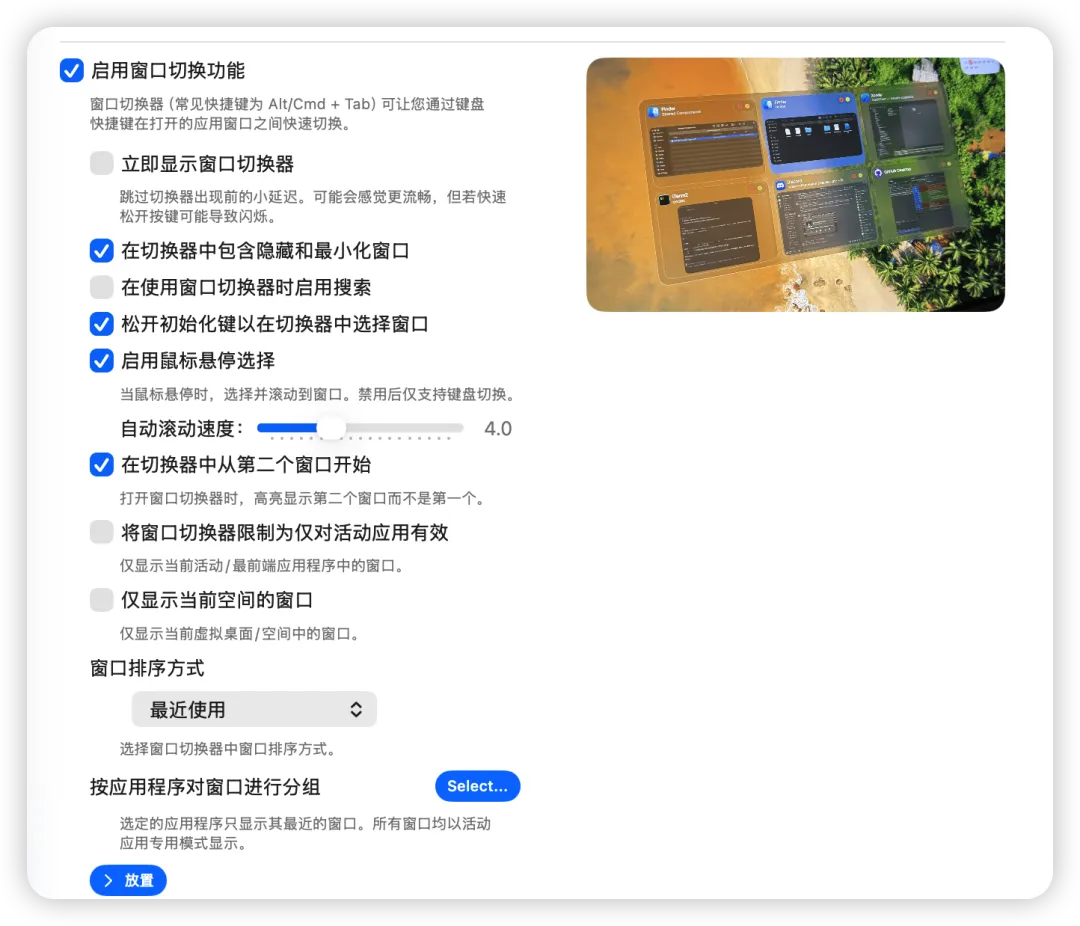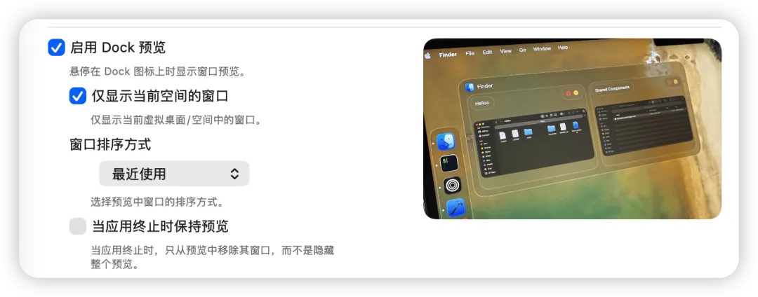 同时缩略图里面的还提供了软件的关闭,打开等按钮,可以在不用打开软件就直接原地关闭它。Dock栏预览大小,透明度功能都可以自行设置。
