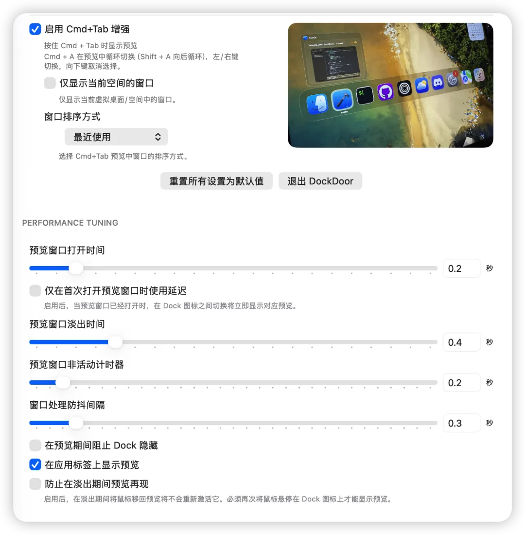 同时缩略图里面的还提供了软件的关闭,打开等按钮,可以在不用打开软件就直接原地关闭它。Dock栏预览大小,透明度功能都可以自行设置。