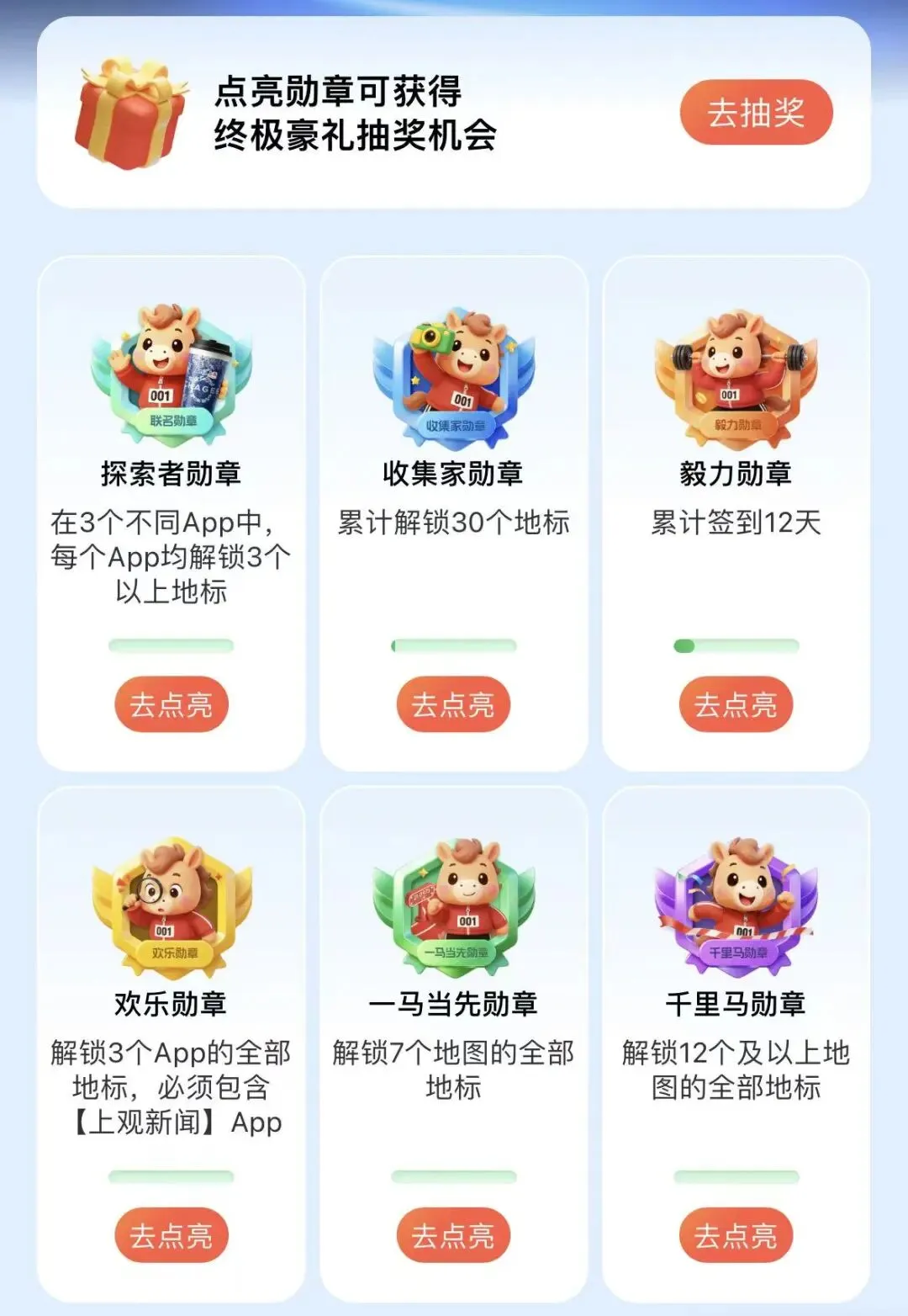 欢乐勋章:解锁3个App的全部地标(其中必须包含上观新闻App),奖励300融耀值,并可额外兑换2次终极抽奖机会。