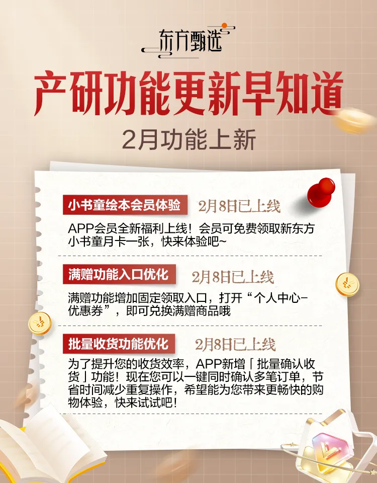 东方甄选APP新功能已上线!快来试试看吧~ 🎈2026年2月东方甄选APP已上线的产研功能,赶紧来看看! 🎁APP会员全新福利上线!会员可免费领取新东方小书童月卡一张,快来体验吧~ 💐满赠功能增加固定领取入口,兑换更方便! 🔥「批量确认收货」功能已上线,一键可确认多笔订单!更节省时间! 🥰欢迎来东方甄选App,体验这些新功能哦!