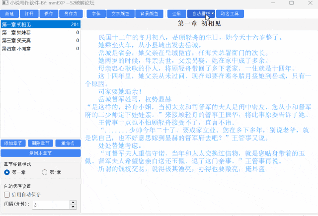 这软件就贴心多了:左边栏能直接加章节、重命名,跟翻书似的一目了然;左下角勾上 “自动保存”,设个 5 分钟间隔,写嗨了忘了点保存也不怕,亲测蓝屏重启后内容还在。