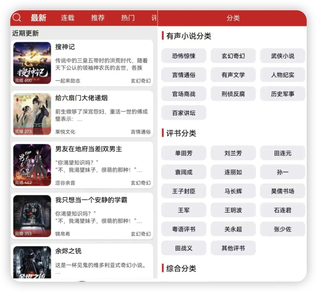 找书便捷:分类逻辑非常清楚,不仅有热门网文,更有世界名著,让经典文学触耳可及。