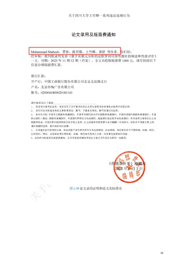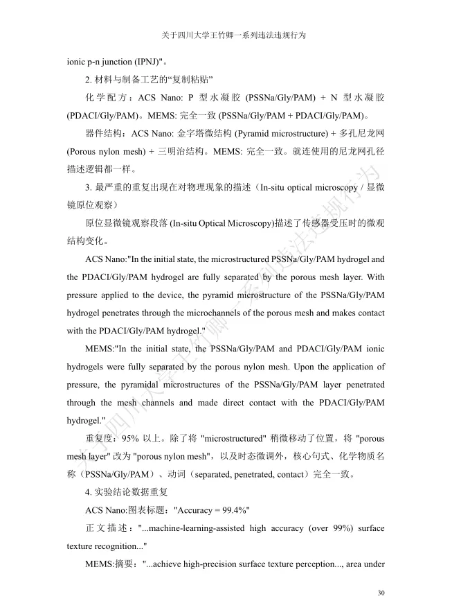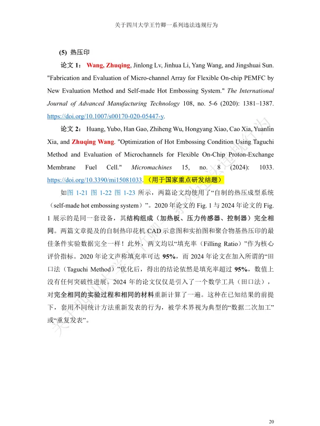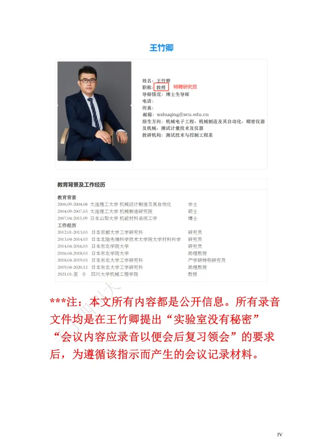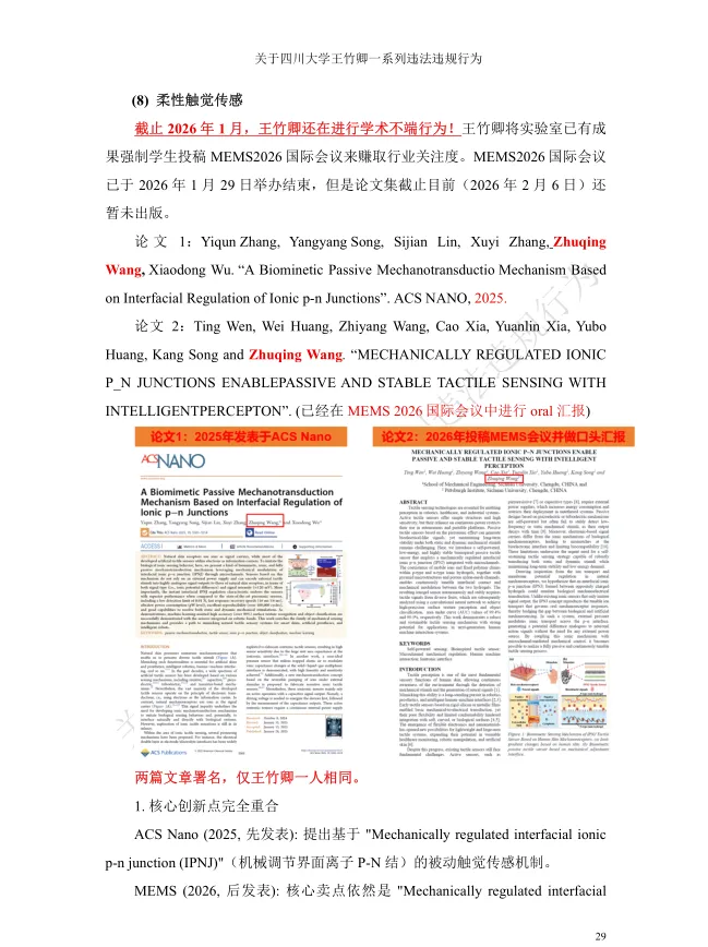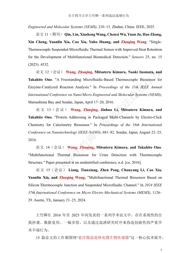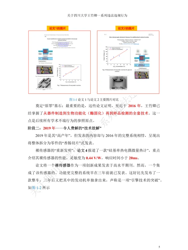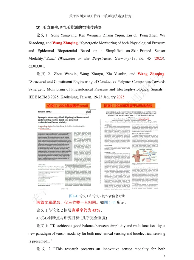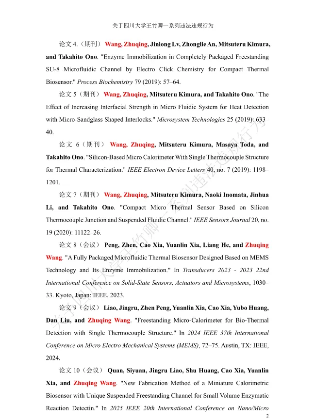 值得关注的是,被举报者王竹卿拥有光鲜的学术履历:本硕毕业于大连理工大学,2011年获日本山梨大学机能材料系统博士学位,2012-2020年在日本京都大学、东北大学等机构从事博士后研究与助理教授工作,归国后入职四川大学,头顶“四川省天府峨眉计划创新领军人才”“微机电系统与智能传感创新中心负责人”“四川大学‘医学+制造’平台独立PI教授”等光环,长期从事MEMS传感器及生物医学检测芯片研究,发表学术论文42篇,其中SCI论文35篇,主持多项国家级科研项目,曾是备受瞩目的海外引进学术人才。