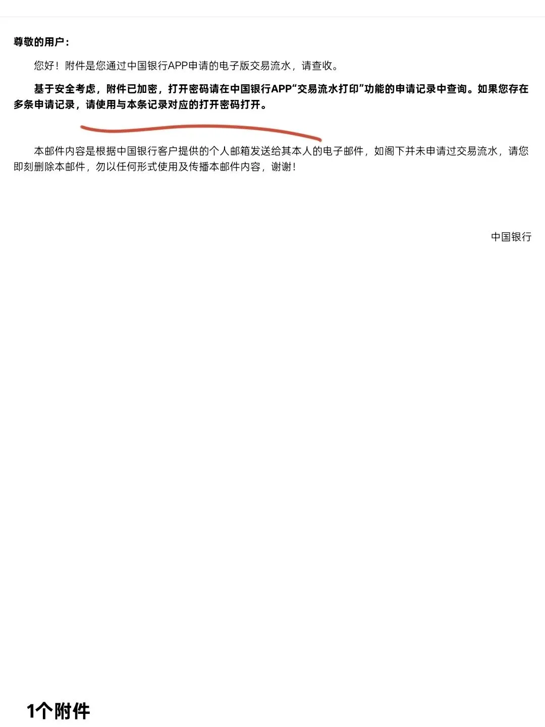 然后,打开邮箱,会看到一个附件,附件的密码,就是发送到手机的交易码。