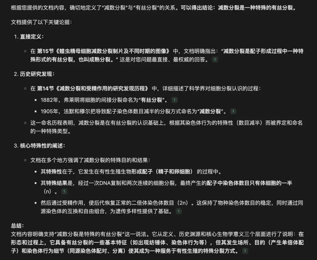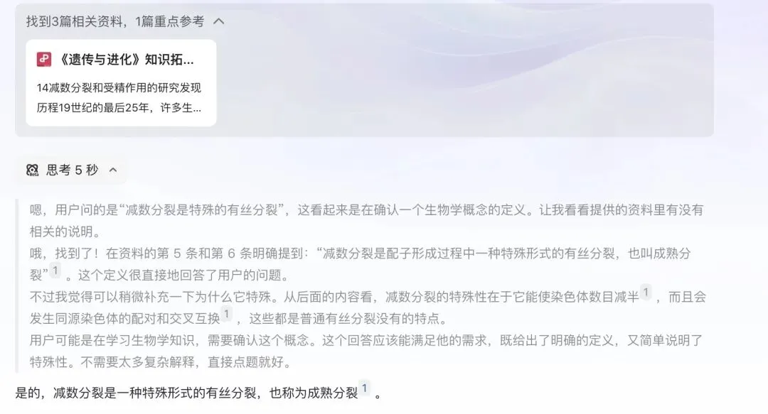 以“减数分裂是特殊的有丝分裂”为检索词基于5本教参构建的WPS知识库和腾讯ima知识库检索区别见下图。