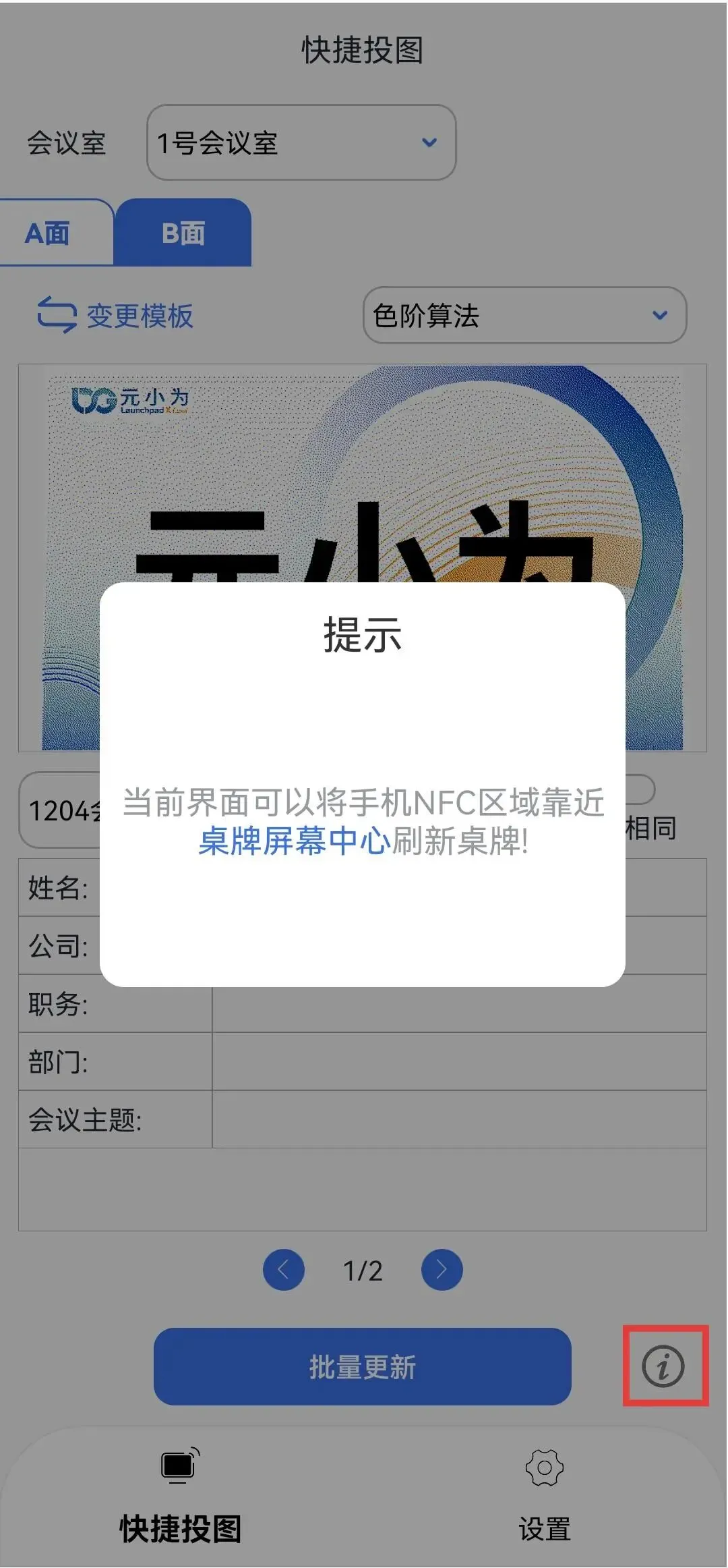 第一次打开 APP后,打开手机NFC,靠近桌牌屏幕中间,NFC自动识别设备屏幕颜色及分辨率属性。