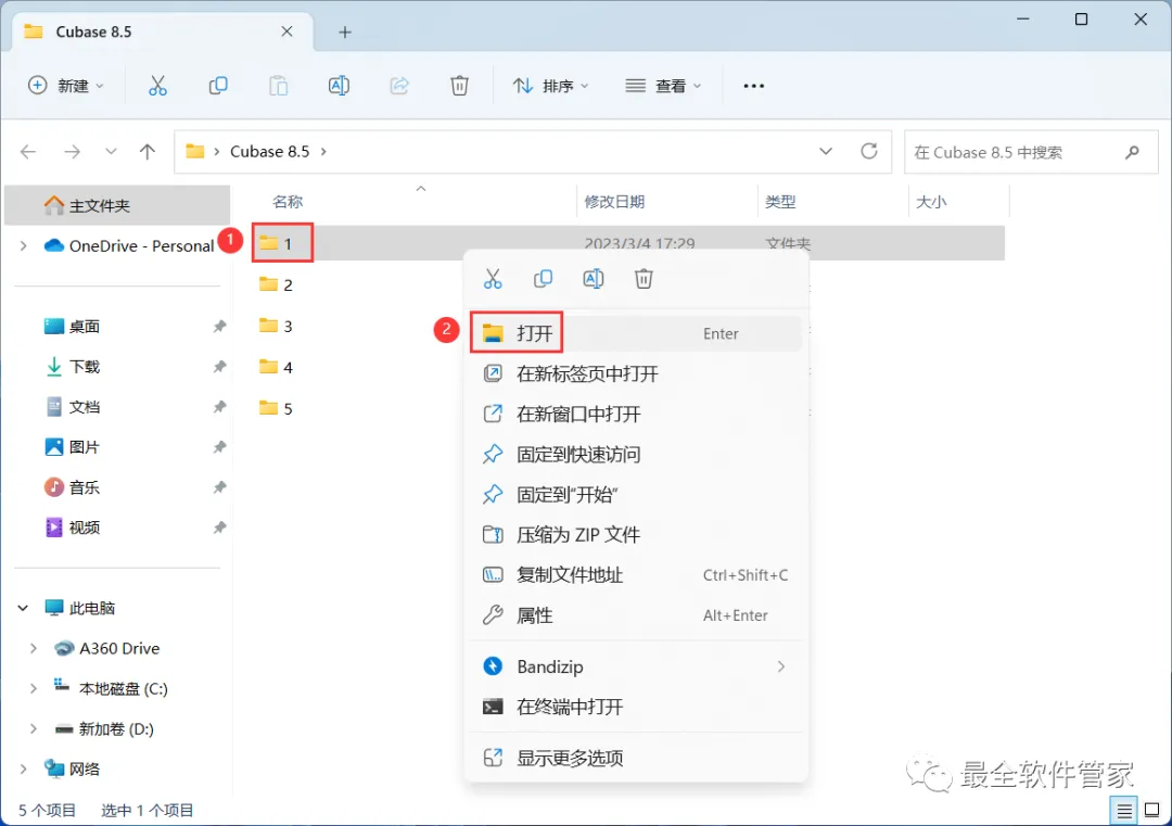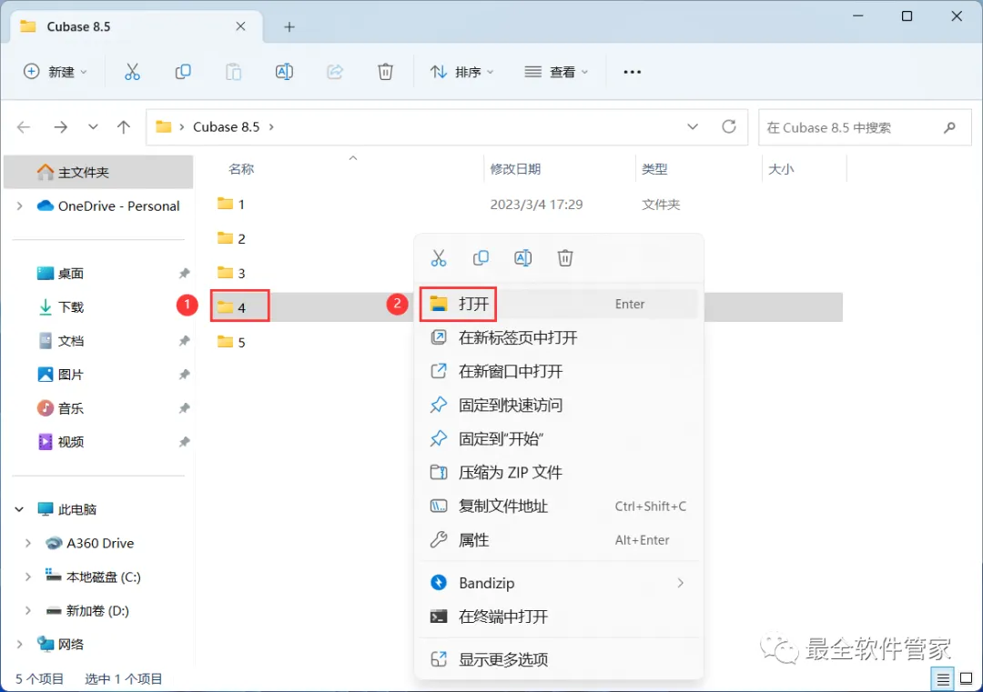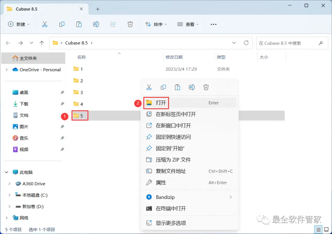 31、回到Cubase 8.5文件夹,找到【5】文件夹,右键【打开】它