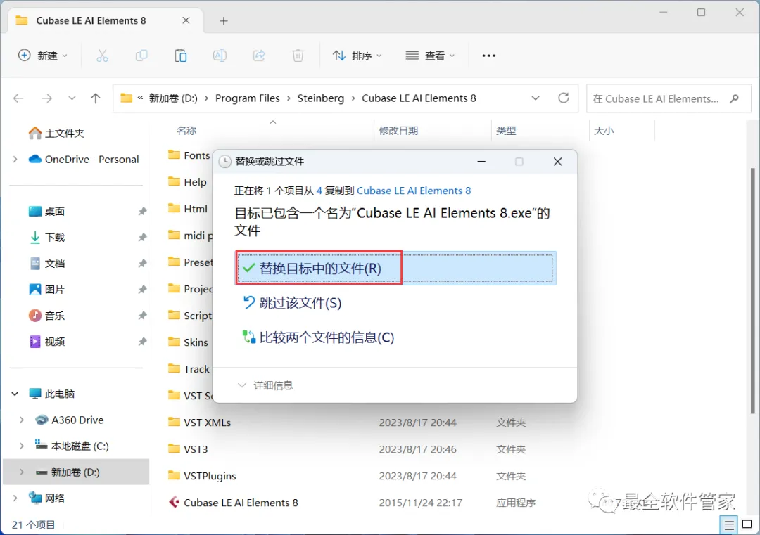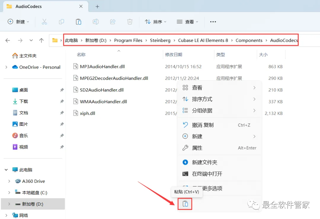 35、打开路径:D:\Program Files\Steinberg\ Cubase LE AI Elements 8\Components\AudioCodecs,再右键文件夹的空白处,点击【粘贴按钮】